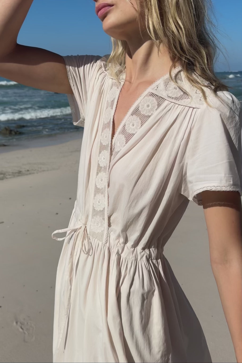 The Dawn Dress was the first piece Christy ever designed, and the Pearl Embroider updates this signature style with the sweetest daisy embroidered eyelet and scallop trims. Available here in 100% Organic Cotton, the Dawn Dress is still our goes-with-everything, first-thing-we-reach-for-in-our-closet, never-fails-to-make-us-feel-beautiful piece, featuring a V-neck with a snap closure, a drawstring waist, and pockets! Wear her with tennis shoes, wear her with boots - wear her with anything!