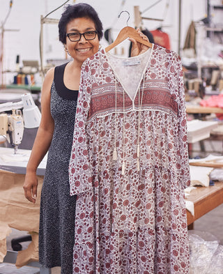 Vicky has been with Anteliza since the very beginning, and she’s been working in the industry since she was seventeen. She went to school to learn how to sew and got her first job right from there. She’s always really enjoyed it. She works mostly in making the samples—which are the dresses that are produced before the design of the dress is finalized—to make sure all the kinks are out of the design and that the pattern is the best it can be. The Paloma is her favorite dress to work on. Her daughter, Nora, started working for the shipping department recently. She loves having her daughter here and getting to see her throughout the day; it makes coming to work that much more comfortable.