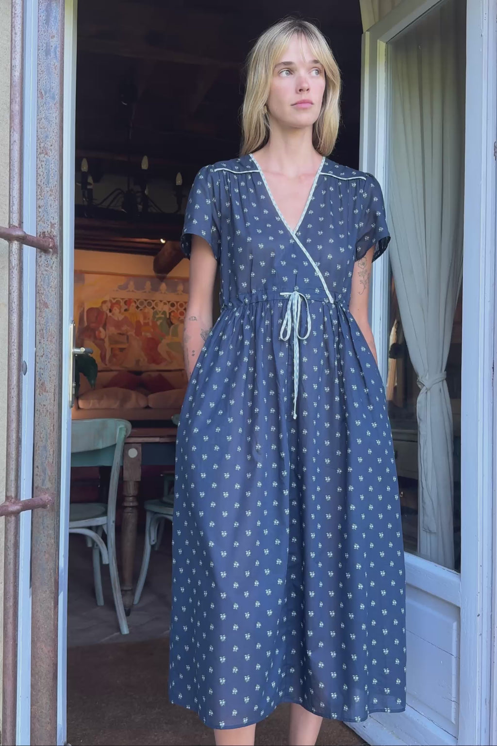 This was the first piece Christy ever designed, and she's still our goes-with-everything, first-thing-we-reach-for-in-our-closet, never-fails-to-make-us-feel-beautiful piece. Updated for the season in the sweetest Blueberry Dot print, this Dawn Dress features a V-neck with a snap closure, a drawstring waist and pockets! Wear her with tennis shoes, wear her with boots - wear her with anything!