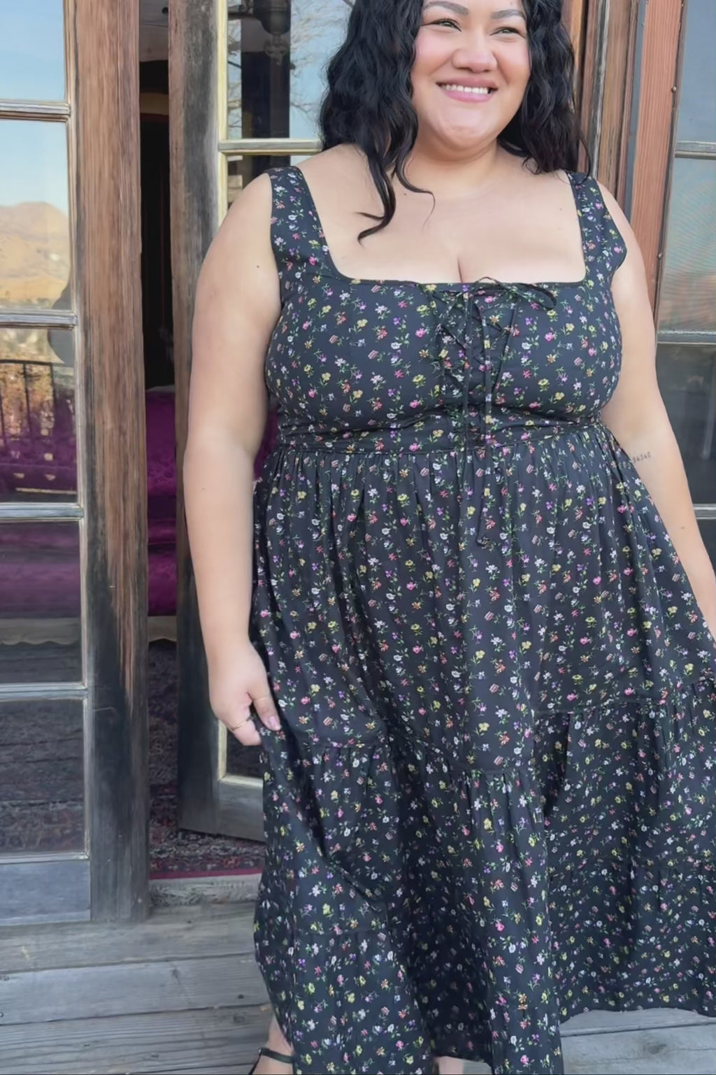 Crafted of 100% regenerative cotton, the Adele Dress in Night Garden brings a sensual air to a classic, vintage-inspired silhouette. With her lace up front and back bodice, tiered and gathered skirt and side seam pockets, she invites us to embody the beauty of simple, effortless femininity.