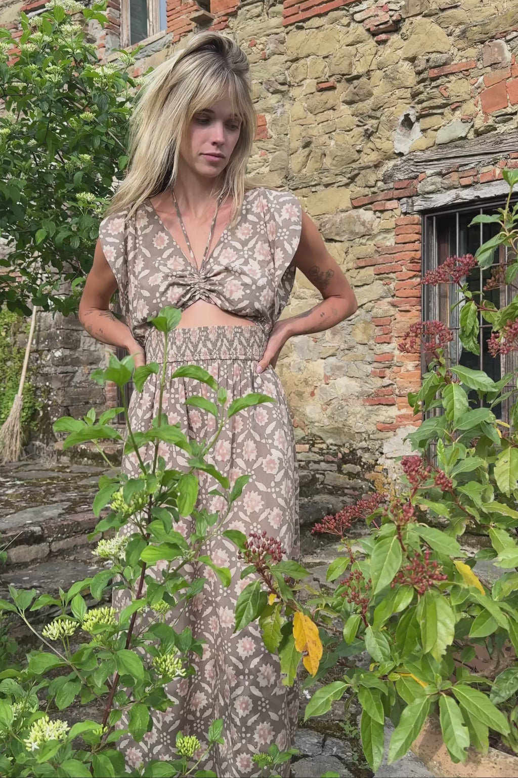 A peekaboo waist cut-out silhouette for summer dressing when we feel most confident. The Anita Dress, crafted of 100% Regenerative Cotton and block printed by hand, features front ruching drawstring that's adjustable to accommodate different sizes and coverage. A tulip detail sleeve creates a draped interest at the shoulder, plus she is finished with on seam pockets, a smocked waist band with elastic, and an elasticated front bodice edge.