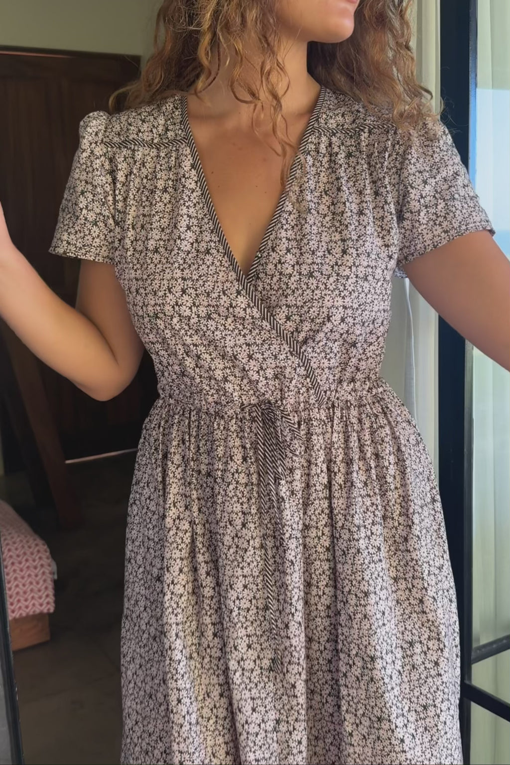 The Dawn Dress was the first piece Christy ever designed, and she's still our goes-with-everything, first-thing-we-reach-for-in-our-closet, never-fails-to-make-us-feel-beautiful piece. Updated for the season in our Noir Phlox print with contrast piping, this midi dress features a V-neck with a snap closure, a drawstring waist and pockets! Wear her with tennis shoes, wear her with boots - wear her with anything!