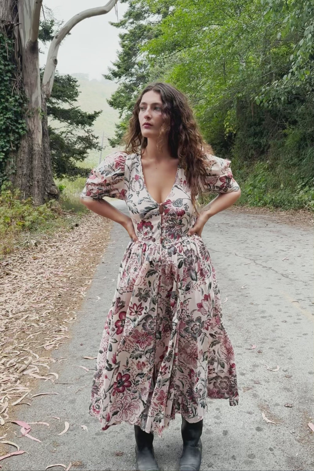 The Marie Dress is back for our last installment of Fall, finished in the Autumn Garden Bisque print. Fitted, with a v-neck bodice and full skirt, this midi-length dress features short puff sleeves finished into a wide cuff, functional button with loop closure on the bodice, and skirt fullness created with godet insets. Crafted from 100% regenerative cotton, this dress heals the Earth!