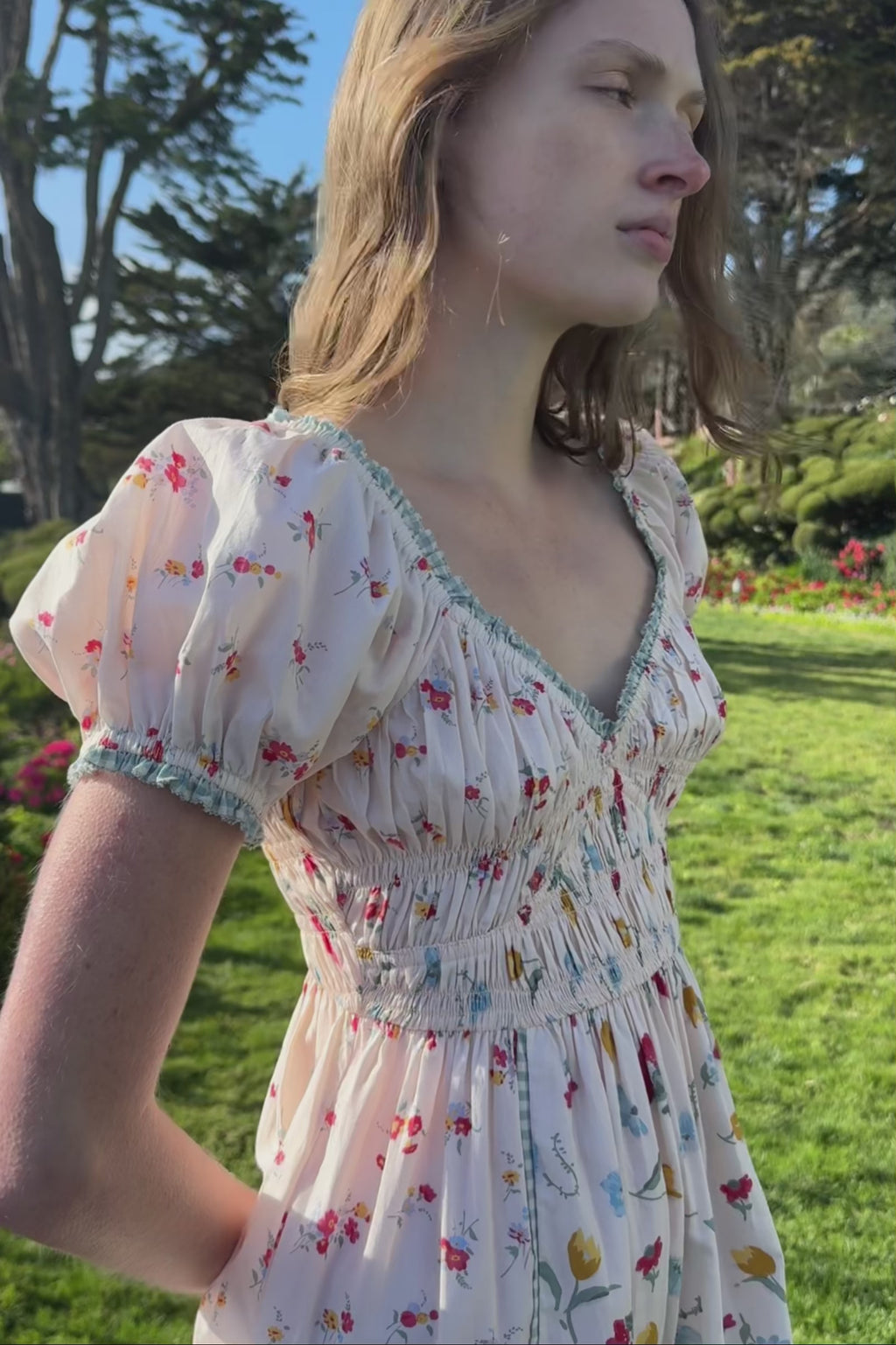Our new silhouette for the season, inspired by 70's gunne sax styles. Crafted of 100% Organic Cotton, the playful design details of the Matilde Dress are balanced by an easy fit and silhouette. The smocking at the bust of the Matilde Dress is intricately placed for a figure flattering effect, and the use of 2 floral prints mixed together creates textural intrigue. The floral prints are balanced by a coordinating blue gingham trim and ruffle.